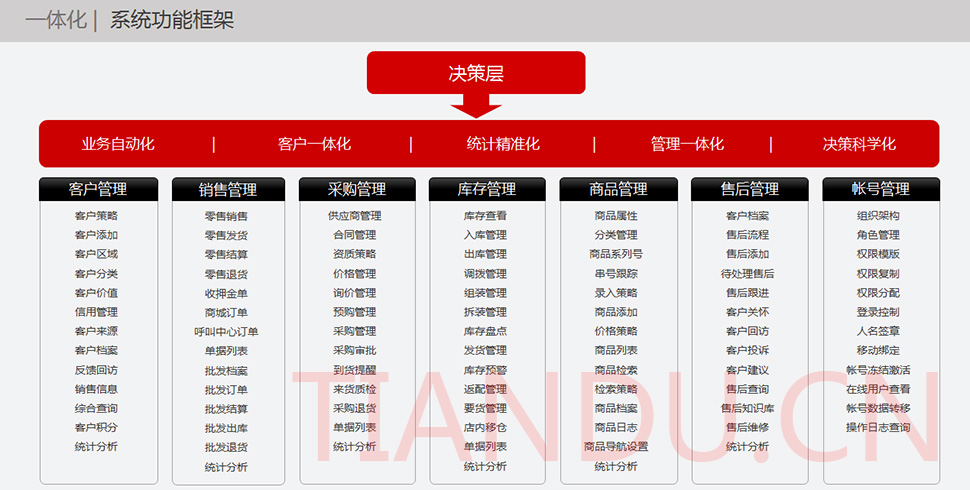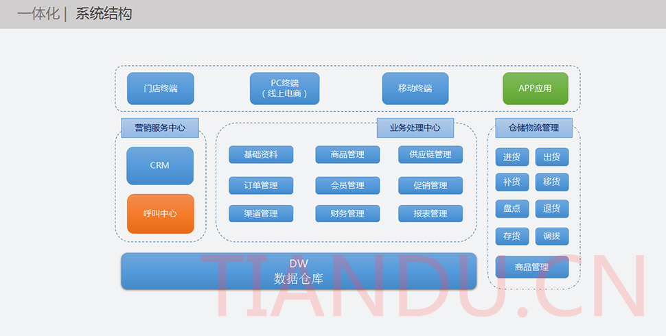 尊龙凯时科技互联研究院(博士后科研工作站)、尊龙凯时软件系统有限公司、尊龙凯时科技股份有限公司合力近400人专业研发团队,结合自身11年电子商务运营经验,全力打造TDMALL电商ERP系统:整合电商网站平台(PC版、触屏版、微信版、APP版)、ERP企业资源管理系统、CRM客户关系管理系统、财务管理系统、OA办公系统和Call Center呼叫中心等系统,实现前端电商平台及后端强大支撑系统的管理。